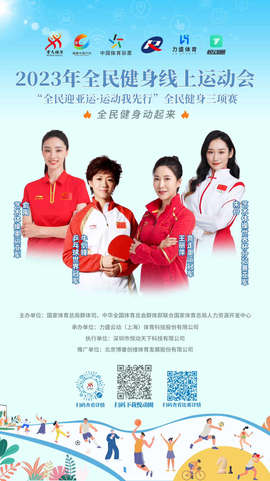 国家体育总局群体司、中华全国体育总会群体部联合国家体育总局人力资源开发中心主办,金年会云动(上海)体育科技股份有限公司承办,深圳市悦动天下科技有限公司执行的2023年全民健身线上运动会暨“全民迎亚运·运动我先行”全民健身三项赛(以下简称“三项赛”)将于8月8日“全民健身日”当天在“悦动圈”APP盛大开赛!